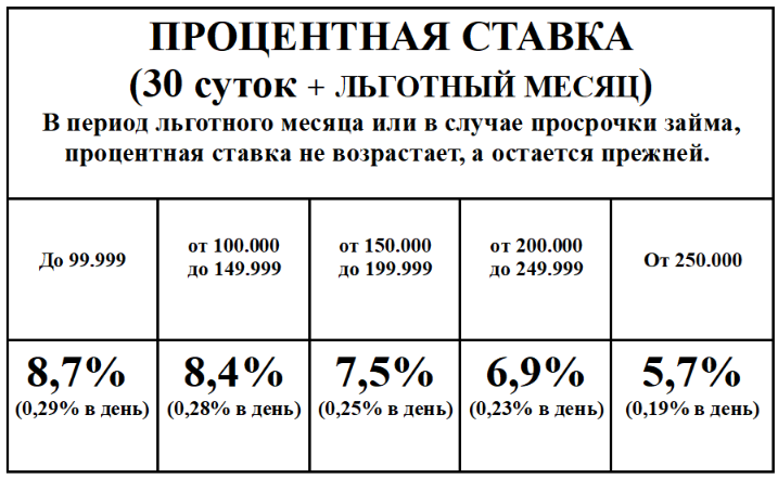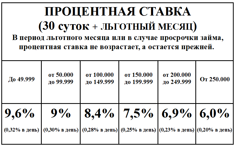 В период льготного месяца или в случае просрочки займа, процентная ставка не возрастает, а остается прежней.